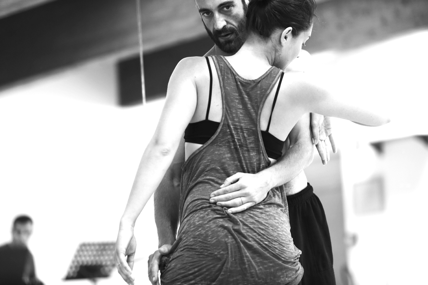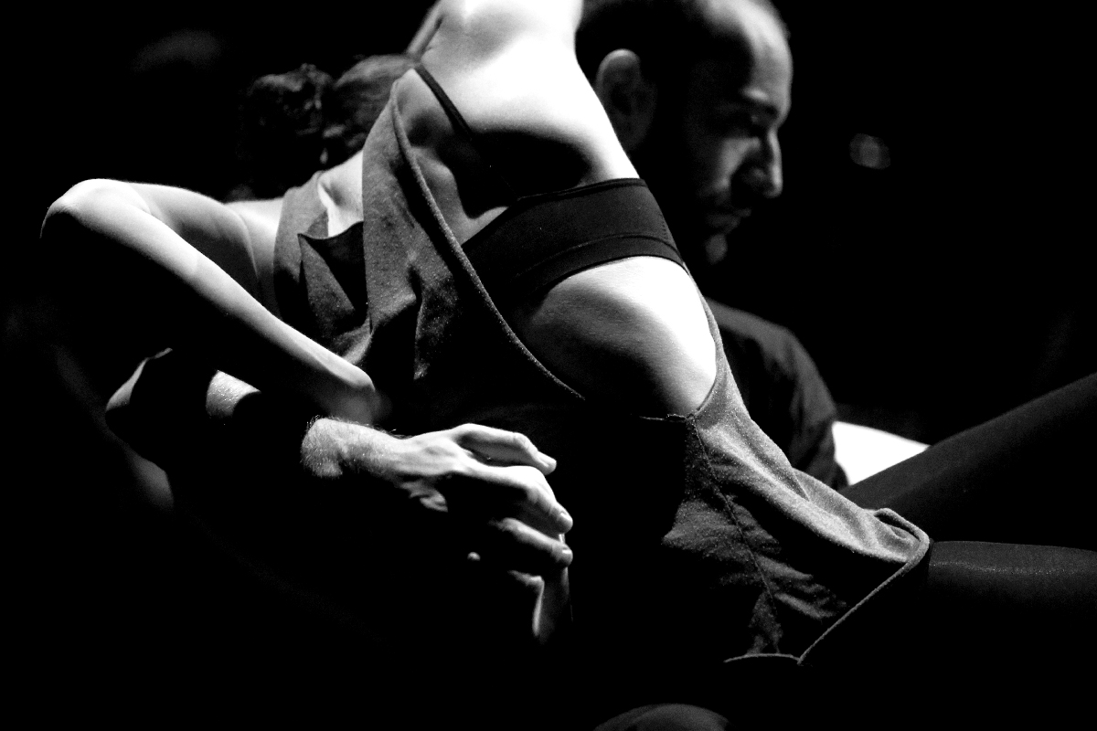 Un percussionniste caresse la peau de son tambour ; le danseur caresse celle de sa partenaire. Un musicien s’acharne sur le métal de ses instruments quand la danseuse frappe l’homme qui la poursuit. De la tendresse à la violence, d’un effondrement à une reconstruction, des visages se croisent, se crispent et se sourient, des émotions affleurent, une histoire se raconte entre force et pudeur, en deçà des mots ou au-delà d’eux… // A percussionist caresses the skin of his drum ; the dancer caresses the skin of his partner. A musician persecutes the metal of his instruments while the woman beats the man who follows her. From tenderness to violance, from a collapse to a reconstruction, faces meet, wrinkle and smile, emotions appear, a story is told, below or belong words…