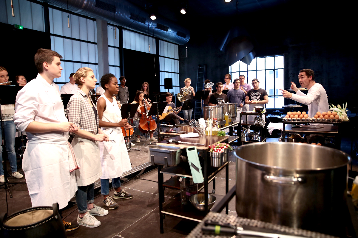 Un projet fou dans lequel les sons de la cuisine engendrent la musique. Dans une osmose de gestes, le batteur soliste entraine cuisiniers et musiciens. Ensemble, ils font entrer le public dans la chair du son, entre acoustique et électroacoustique, entre couleurs, saveurs et odeurs. Le concert est la préparation du repas. Le public mange ensuite ce qu’il vient d’entendre. // A crazy project in which the sounds of cooking generate the music. In an osmosis of gestures, the soloist drummer leads cooks and musicians. They drive together the audience inside the flesh of sound, between acoustics and electroacoustics, between colors, flavours and smells. The show is the preparation of the dinner. Then, the audience eats what it has just listened to.